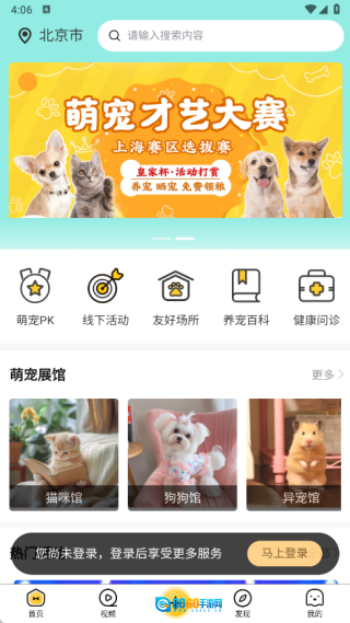 1. 首页设有萌宠PK、线下活动、友好场所、养宠百科以及健康问诊等版块,还能了解萌宠展馆功能。