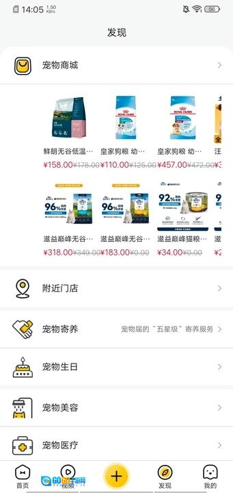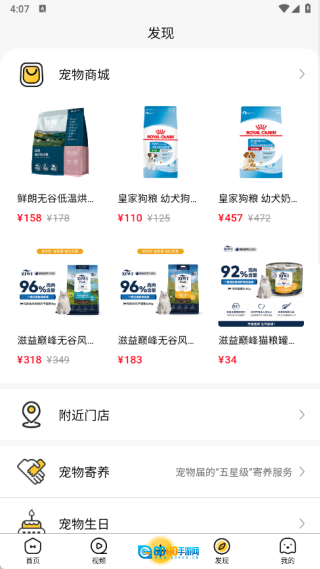 3、于发现页面设置宠物商城、附近门店、宠物寄养以及宠物生日等板块。