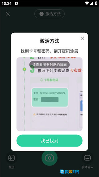 随后,软件会提供激活方法的小视频供用户观看。通常,激活方法是在实体图书的使用手册里,从中能够找到卡号与密码,接着刮开密码涂层就能看到密码。