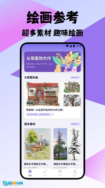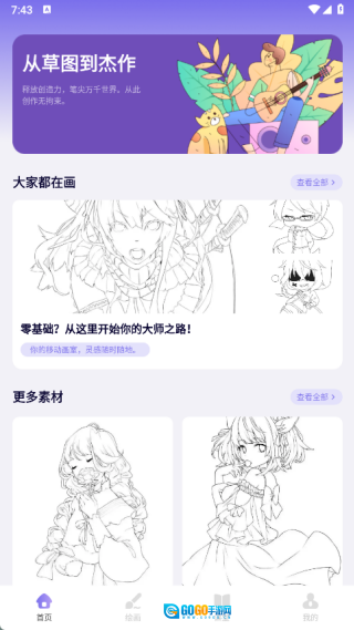 1、首页提供了各类素材,方便用户依据不同素材进行绘制。