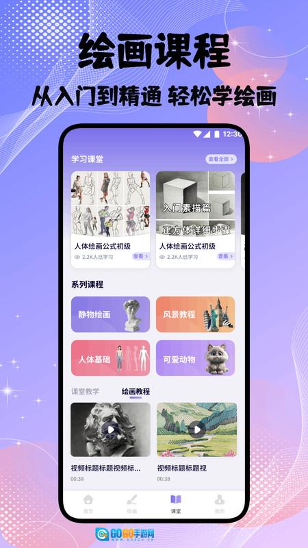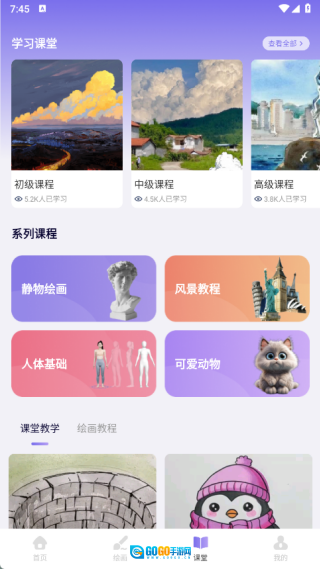 4、课堂页面涵盖初级课程、中级课程、高级课程以及系列课程,在此还能了解课堂教学与绘画教程。