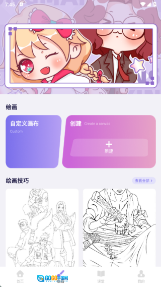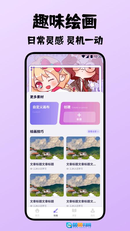 3、绘画页面具备自定义画布、创建这两大功能,同时还涵盖绘画技巧。