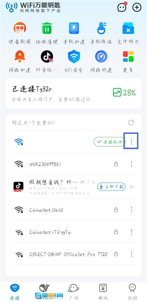 1. 开启WiFi万能钥匙,轻点已连接WiFi旁的三点图标。