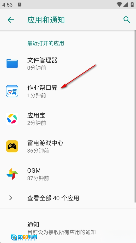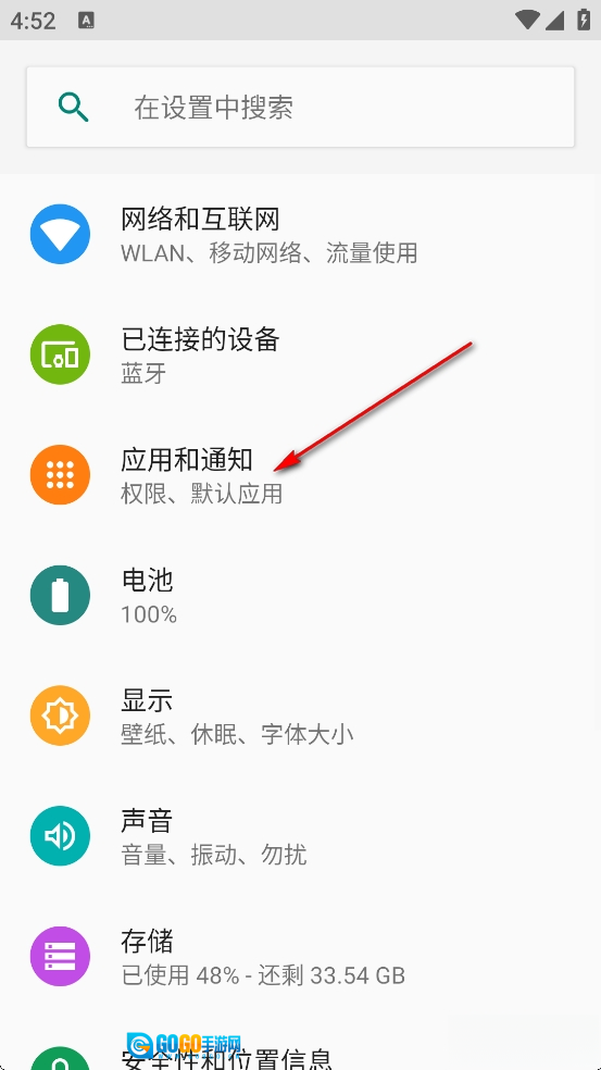 打开手机设置页面,随后点击【应用和通知】。
