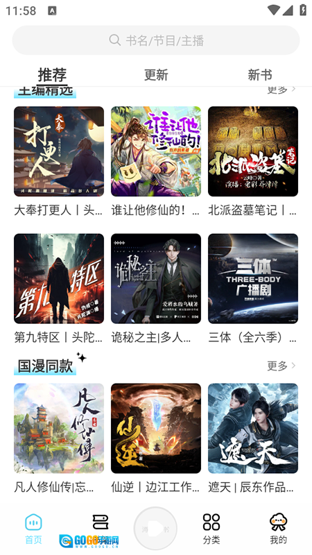 2、海云听书纯净版的听众,能够毫不费力地收听自己钟爱的高质量音频节目。其首页清晰设有推荐、更新、新书等分类。