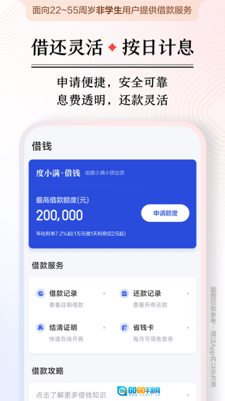 2. 息费清晰明了:年化利率最低7.2% ,借1万元每天利息至少2元,年化利率范围在7.2%至24%之间。