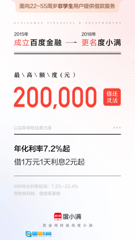 度小满作为综合类金融服务平台,向大众提供互联网信贷、优质基金销售以及安心保险服务。度小满拥有多种牌照,与数百家银行及持牌金融机构展开合作,在信贷、理财、保险、支付等多个领域,为用户供应值得信赖的金融服务。要是资金周转,就找度小满!