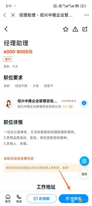 4、最后可选择投递简历,也能直接打电话进行在线联系。