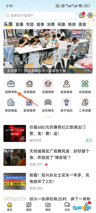 1. 打开绍兴E网App,在首页能看到【招聘求职】,点击它。