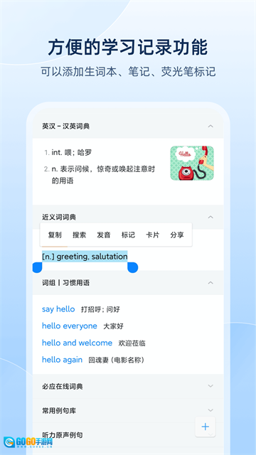 跨软件取词功能:在使用其他软件过程中,只需长按便能进行查词操作,随后释义会自动显示。