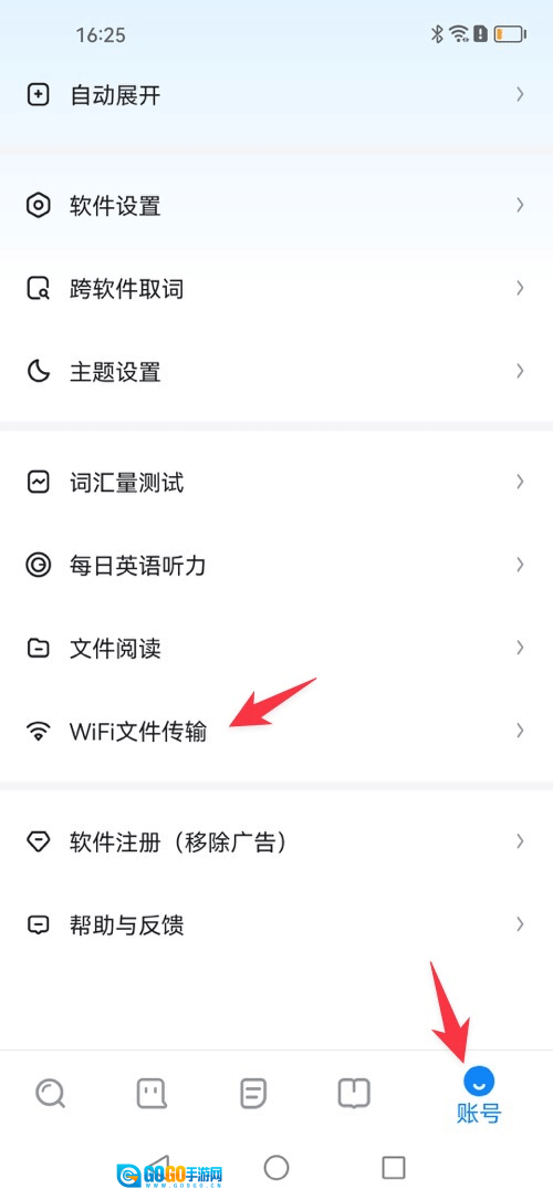 1、举个例子,以欧路词典来说,在帐号Tab处点击WiFi文件传输。