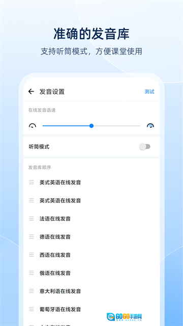 可自由挑选美音或英音,还能自行设定发音语速,各类小语种发音也一应俱全。