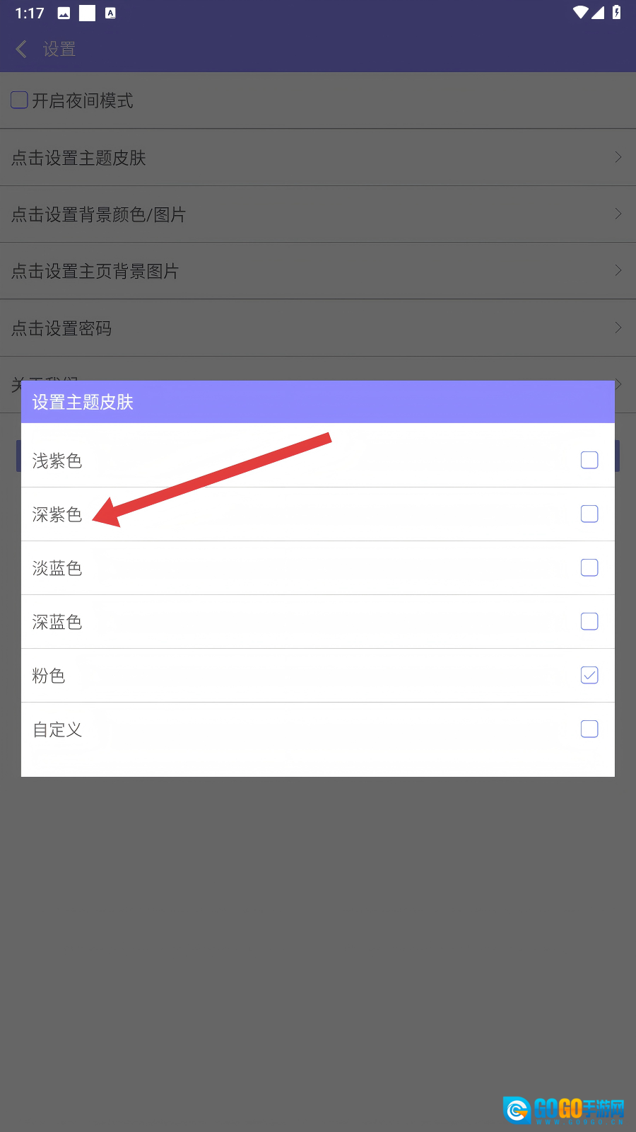 4、在主题皮肤列表里,挑选自己喜欢的风格,比如【深紫色】,点击相应选项就能应用,使界面呈现全新面貌。