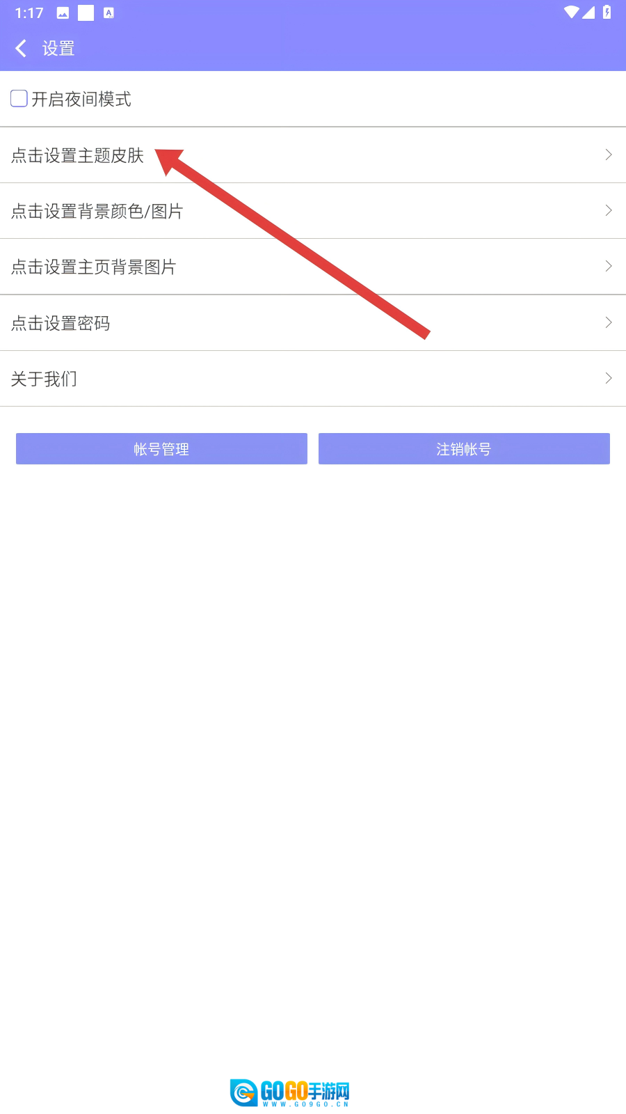 3、当您进入设置界面后,轻点【点击设置主题皮肤】这一选项,随即就会进入主题皮肤选择列表,如此便离目标更近一步啦。