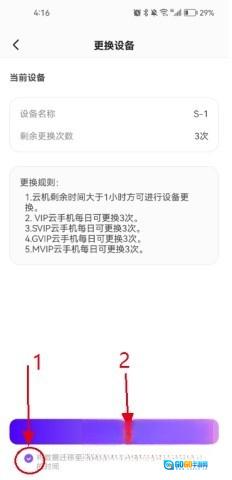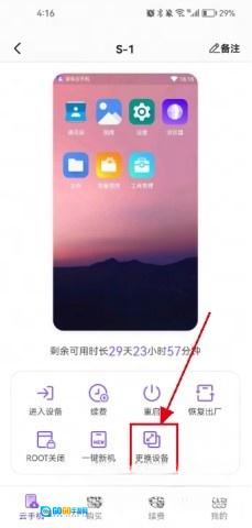 1、于主界面之中,寻得你要更换的云手机,点击【更换设备】按键。