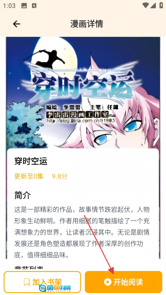 2. 在“我的书架”页面,点击《穿时空运》漫画,即可进入漫画详情页面。