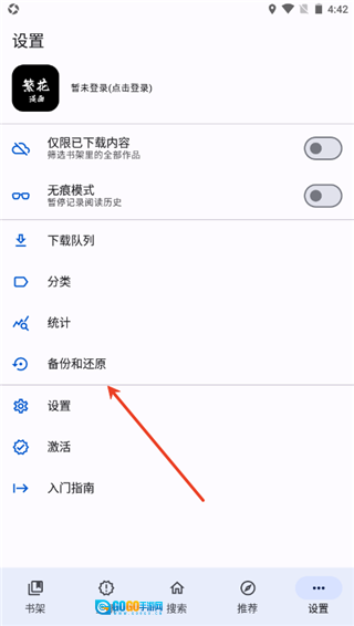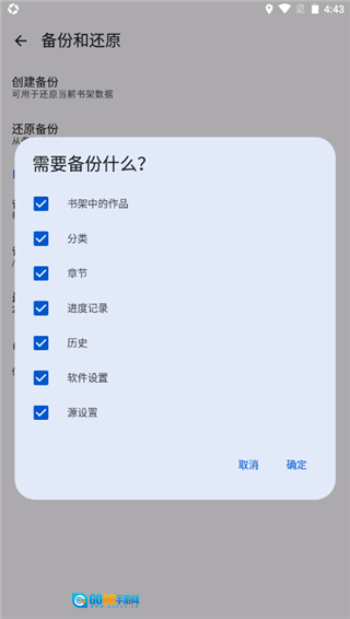 4、点击“创建备份”后,可进一步选择备份的作品类型,包括章节、历史、分类、源设置等。