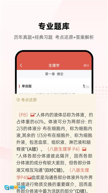 1. 包含各类医学考试的真题与练习题,具备题目搜索、错题整理、笔记记录、收藏等实用功能,达成随时学习、实时归纳的效果。