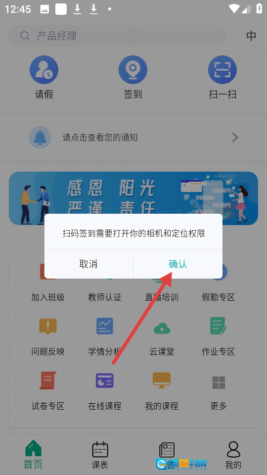 3、当使用【扫码签到】功能时,需要点击【确认】来开启相机与定位权限。
