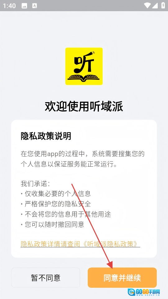 1. 打开听域派,当隐私政策弹窗出现时,点击【同意并继续】,随即进入课程页面。