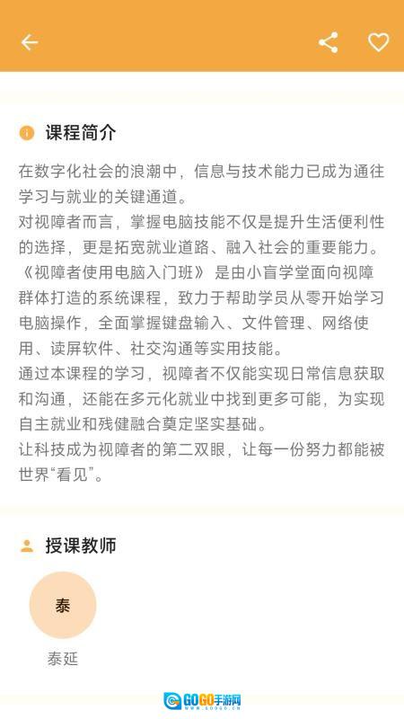 1. 运用无障碍界面设计,全方位与读屏软件适配,保障视障用户操作顺利,不借助视觉就能实现课程选择、学习等操作。