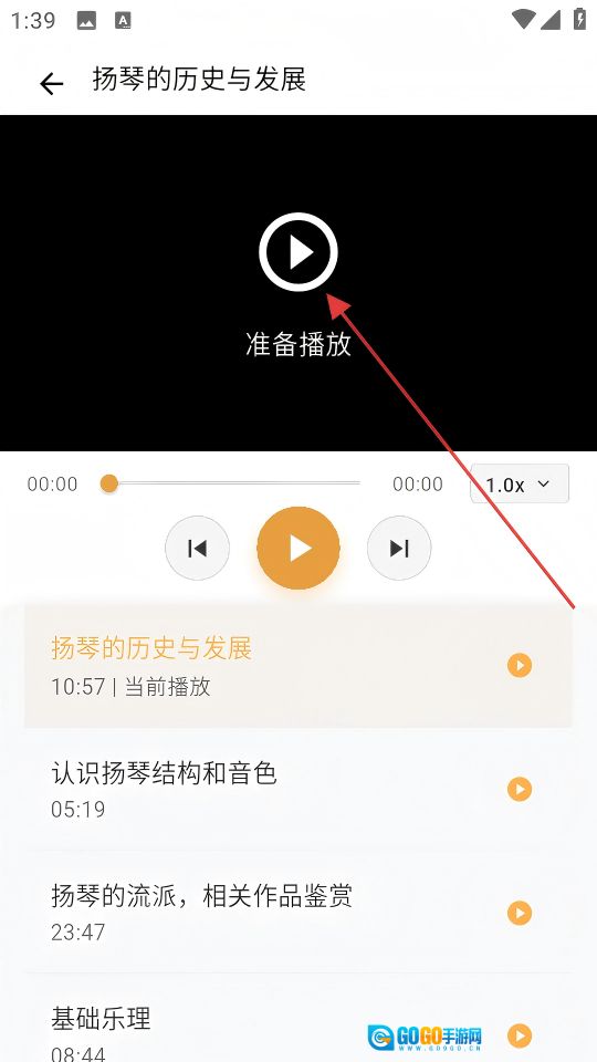 4、进入课程播放页面后,点击播放按钮,即可开启【扬琴的历史与发展】课程内容的学习。