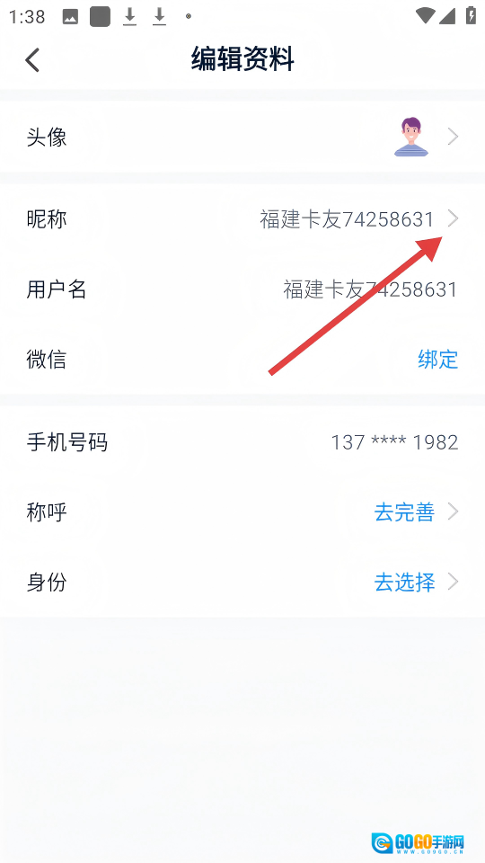 4、进行资料编辑时,点击【昵称】右侧的箭头,就能进入昵称修改页面。