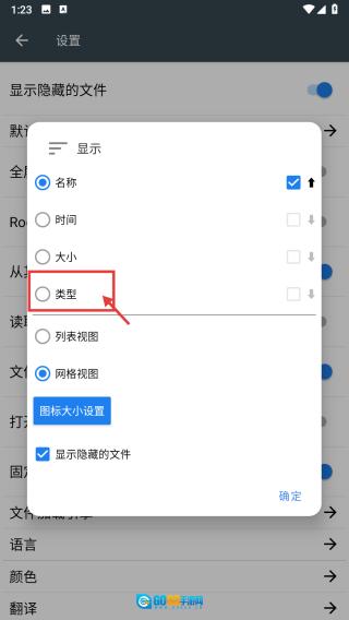 4、于弹窗里,挑选类型选项,从而完成文件默认以类型显示的设置操作。