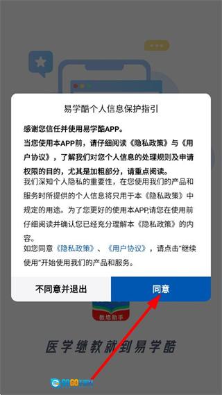 1. 于易学酷个人信息保护指引弹窗里,点击同意,随后进入首页。