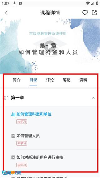 4、在目录里点击“如何管理科室和单位”这一具体章节,即可开始学习课程内容。