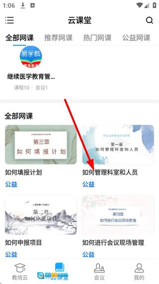3、于云课堂页面,点击“如何管理科室和人员”这一目标课程,即可进入课程详情页面。