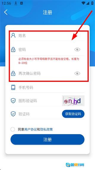 4、于注册页面处,填入姓名,设定密码并进行二次确认。