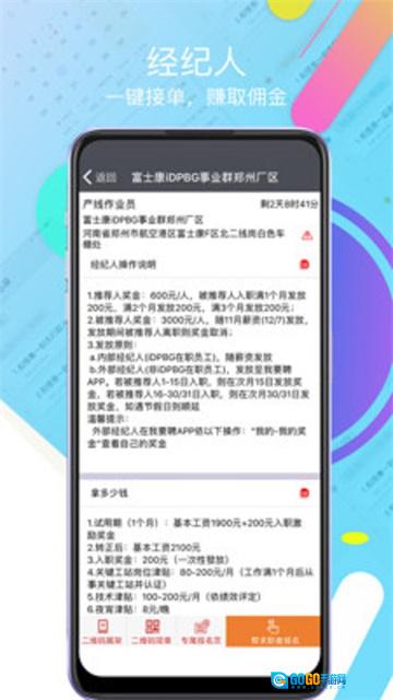 3、富士康支持内部推荐,iDPBG在职人员能够借助我要聘App的“经纪人”窗口,推荐亲朋好友入职富士康。