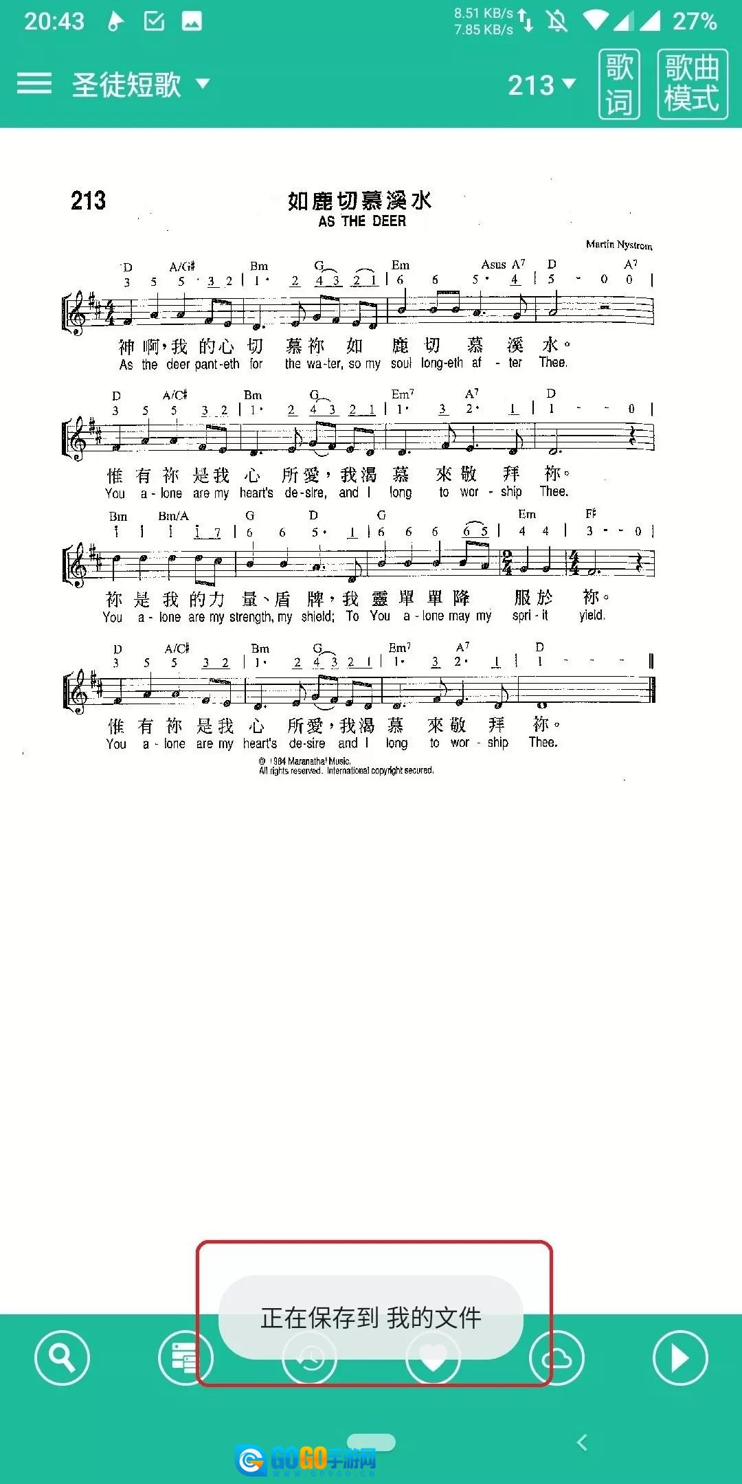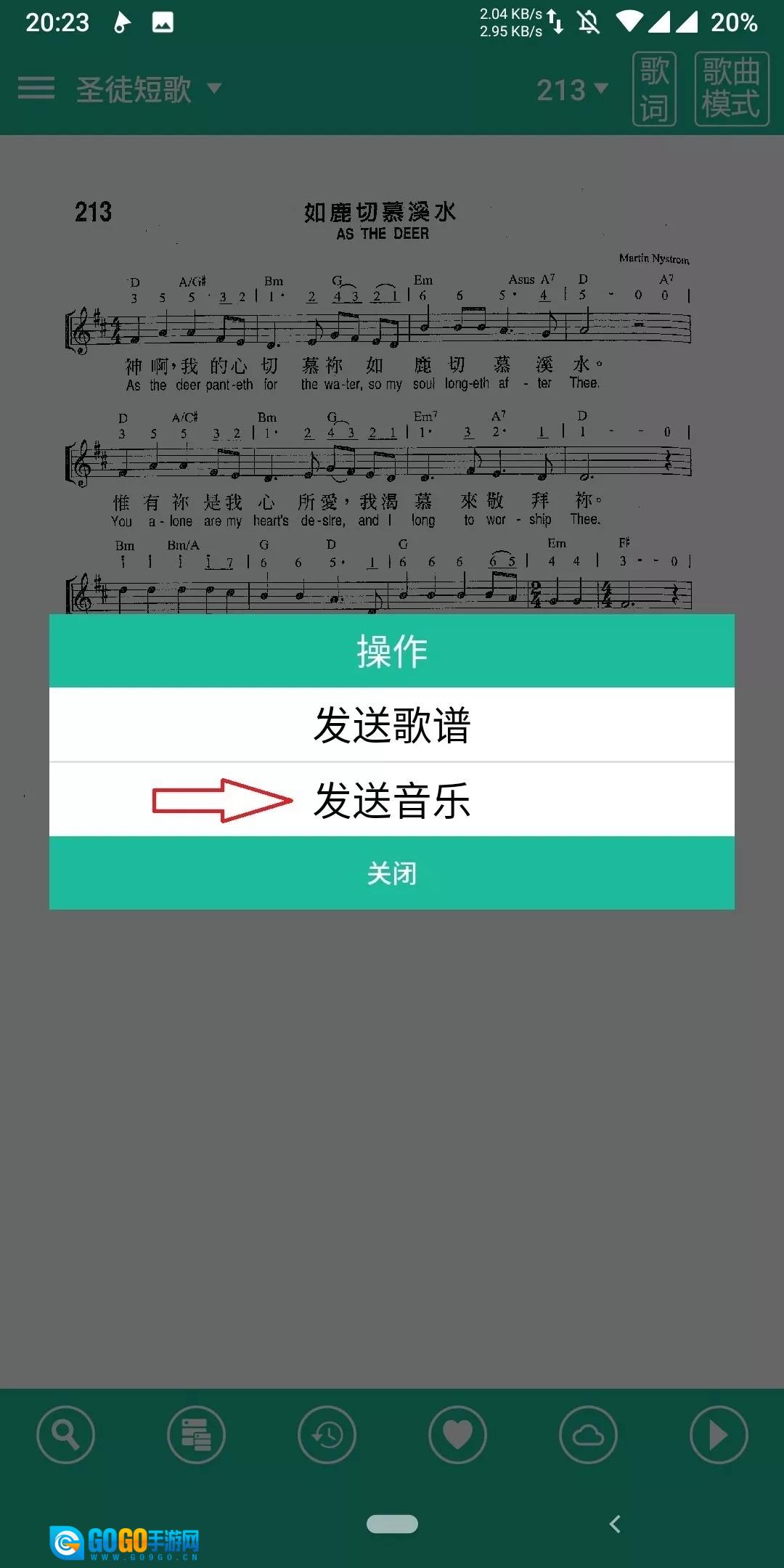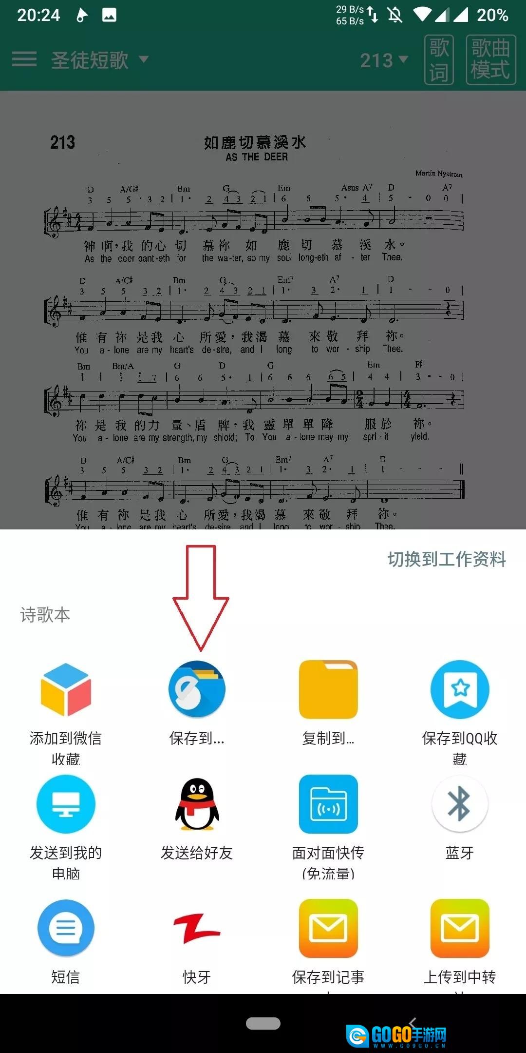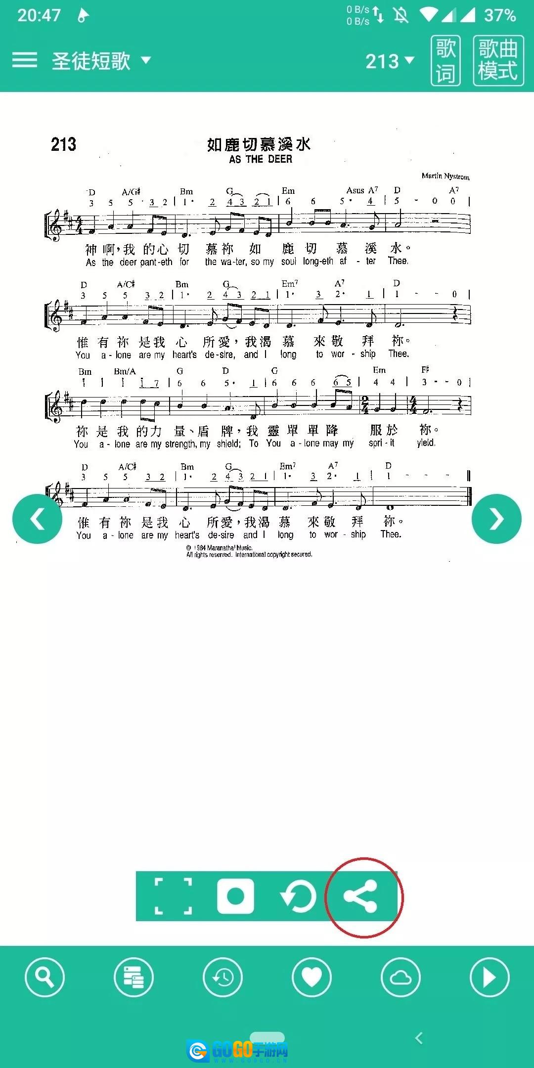1、安装完毕后,步入正题,打开你的诗歌本,找出你想要保存的那首歌,点击歌谱区域,寻得分享按钮。
