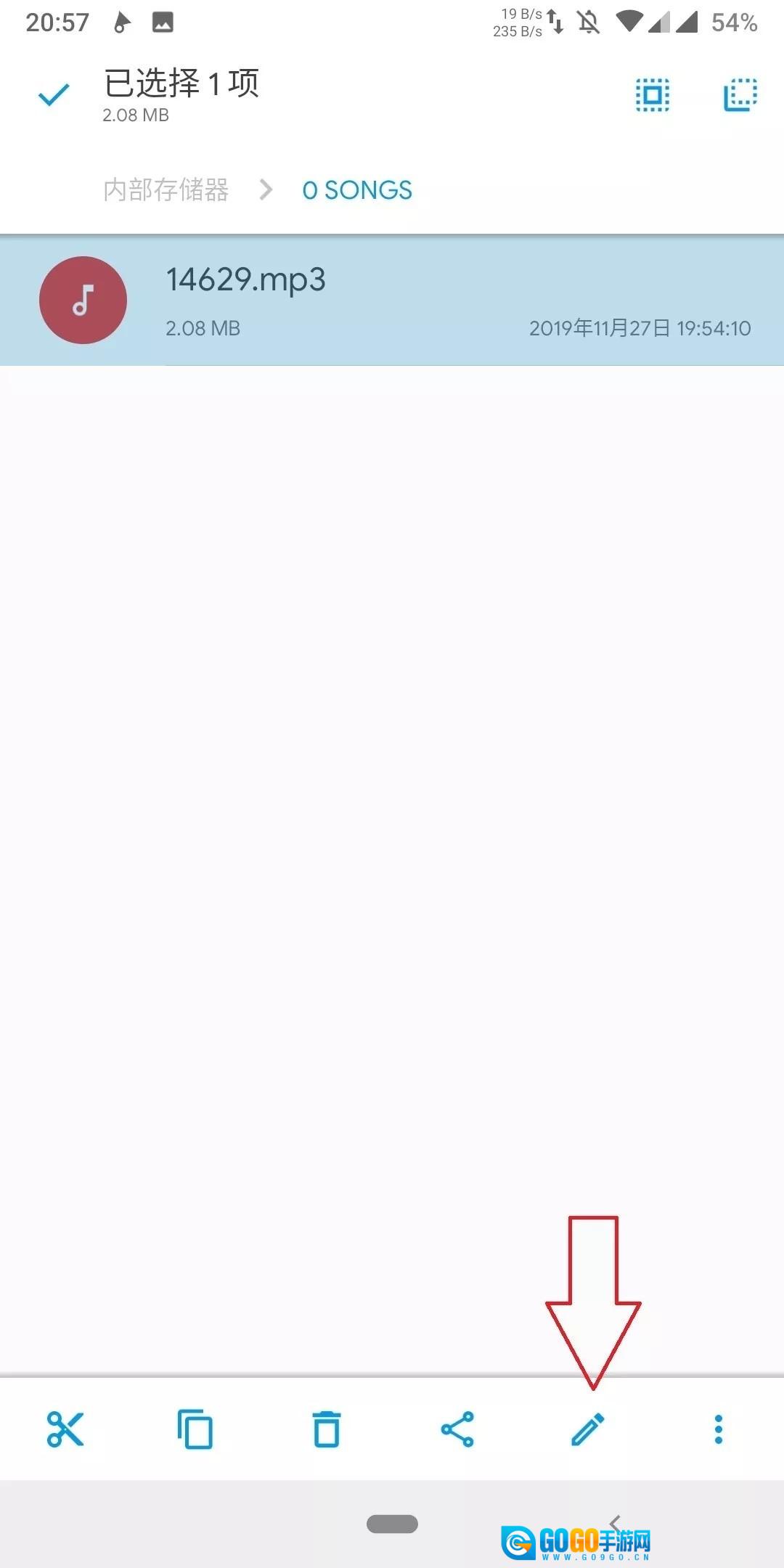 11、请长按,随后点击下方的铅笔图标,即可进行修改。需注意,文件名后缀.mp3不可删除。