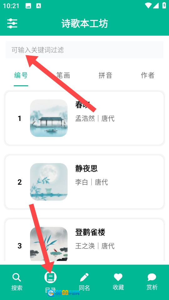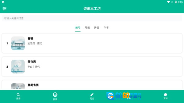 2. 切换到目录页面,借助顶部的过滤框,输入关键词来筛选诗歌内容。