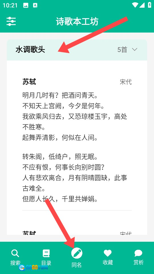 3、进入诗歌详情页后,点击页面底部的【同名】按钮,即可查看与当前诗歌标题相同的其他诗歌作品。