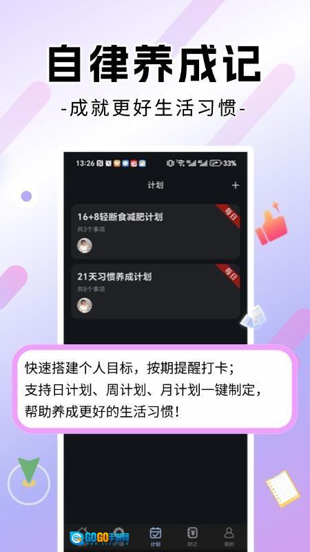 3、可设定个性化目标计划,开启自律打卡模式,记录打卡进程,助力用户养成自律习惯,塑造良好生活方式。