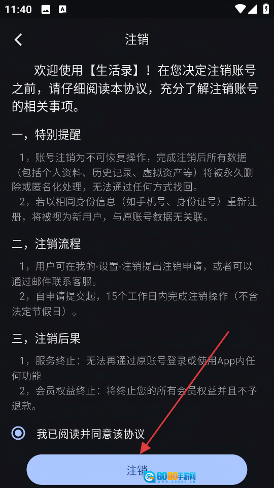 4、于注销协议页面,点击【注销】按钮,以完成账号注销操作。