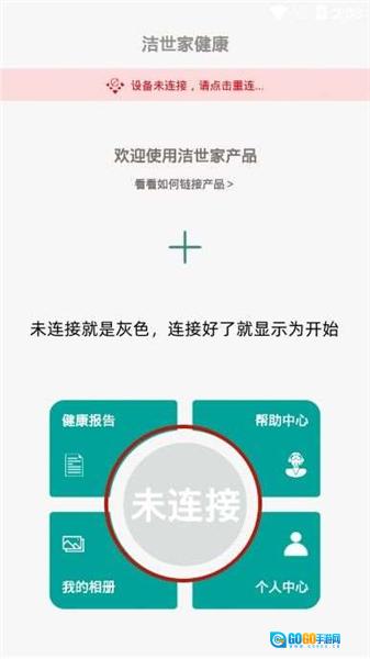 3、开启洁世家健康应用,点击“开始”图标。若第二步尚未完成,会显示灰色的“未连接”图标,点击此图标同样能够智能跳转并连接WiFi 。