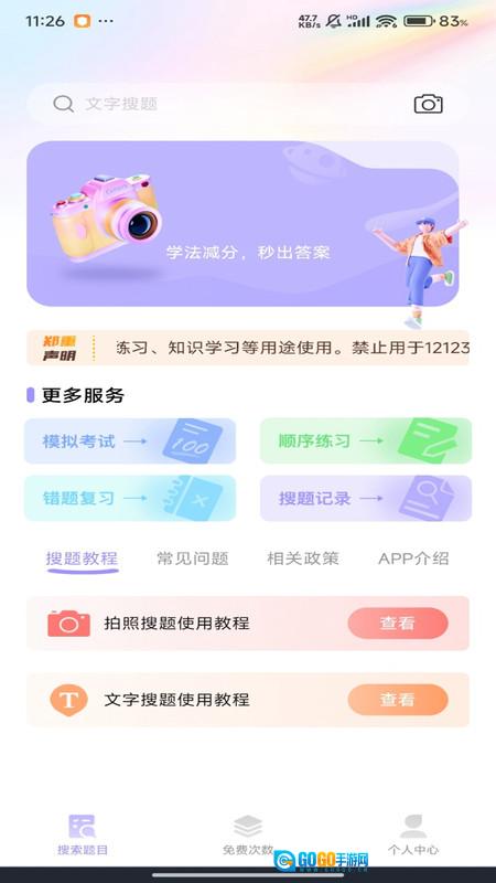 1、进入安装后的搜索题目页面,可看到搜题与答题服务,免费开启。