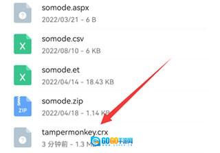 1、第一步,我们要在电脑上找到油猴文件并【点击】,解压后会得到一个.crx文件。接着,通过QQ或者微信,把这个文件发送到手机上。