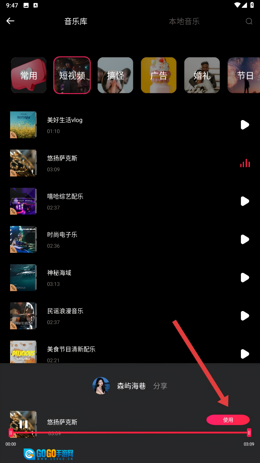 2、点开【音乐库】,从中挑选心仪的音乐,像【悠扬萨克斯】,接着点击右侧的【使用】按钮,这样就能把它添加到视频里咯。