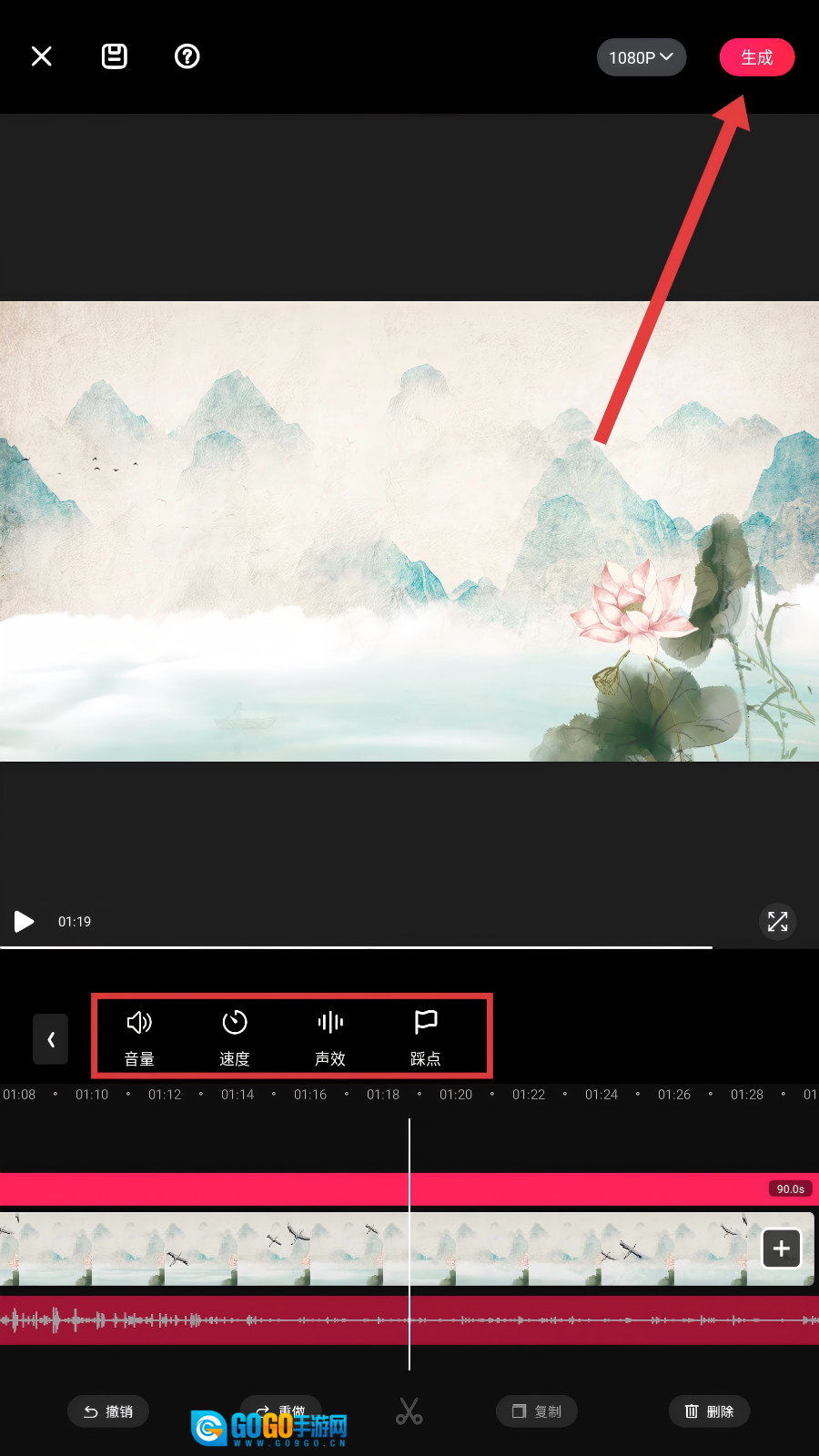 4、当你完成音乐、音效等编辑工作后,只需点击右上角的【生成】按钮,即可导出制作完成的视频,快来试试吧。
