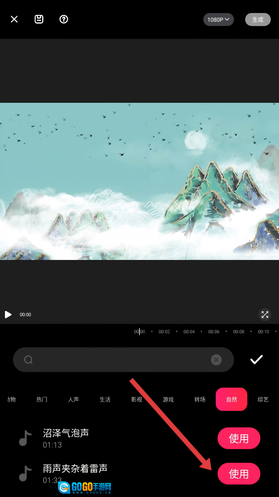 3、要是想添加音效,可在音效列表中挑选合适的,比如【雨声夹杂着雷声】,点击【使用】按钮就能添加,从而丰富视频的听觉效果。
