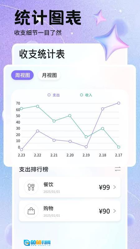 3、以直观图表展示财务数据,把复杂的收支信息转变为可视化内容,使用户能够迅速抓住消费关键要点,清楚明晰地掌握自身财务趋势。