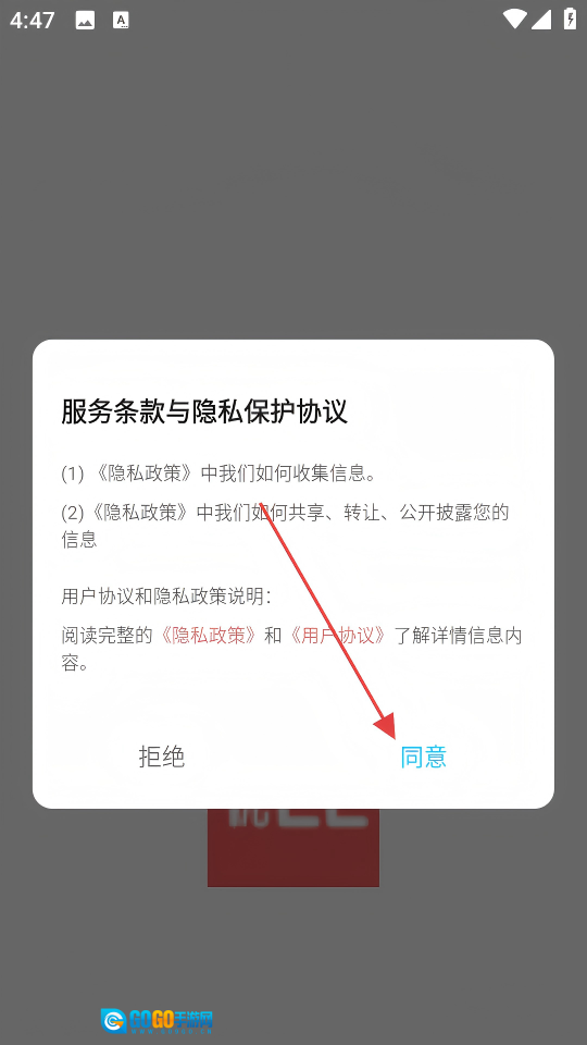 1. 于服务条款与隐私保护协议弹窗里点击【同意】,即可进入精选首页。