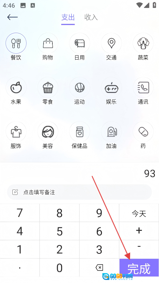 3、于支出分类选择界面挑选消费类别,填入消费金额,随后点击【完成】。