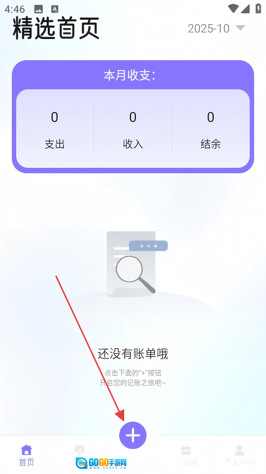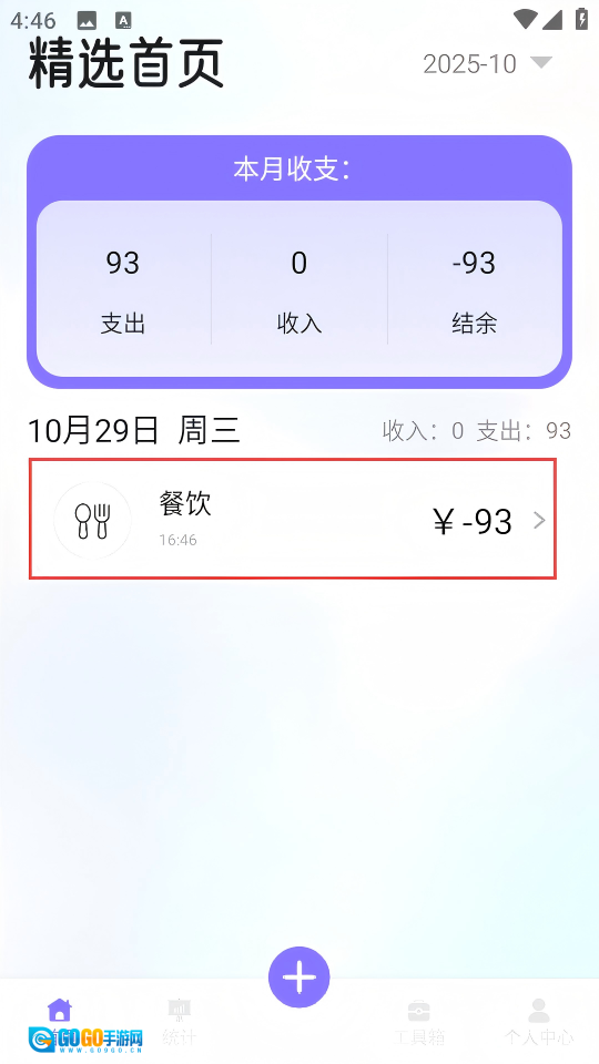 2. 于精选首页,点击下方的“+”按钮,随即进入支出分类选择界面。