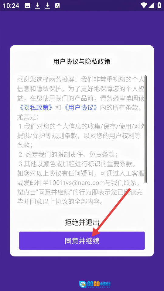 1. 点击【同意并继续】,即表示同意《用户协议》与《隐私政策》,随后可继续使用雨燕投屏。